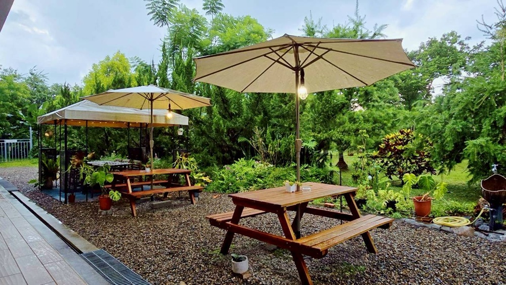 傍晚剛下過一場小雨,空氣裡還帶著清新的濕潤氣息,庭院裡的綠意在雨水洗滌後顯得更加鮮亮。木質桌椅被雨水映照得閃閃發亮,搭配傘燈柔和的光線,營造出一種靜謐又帶點浪漫的氛圍。坐在這樣的環境裡,伴隨著蟲鳴和清新的泥土香,彷彿時間都慢了下來,特別適合三五好友小聚,或者靜靜享受片刻的放鬆呢。