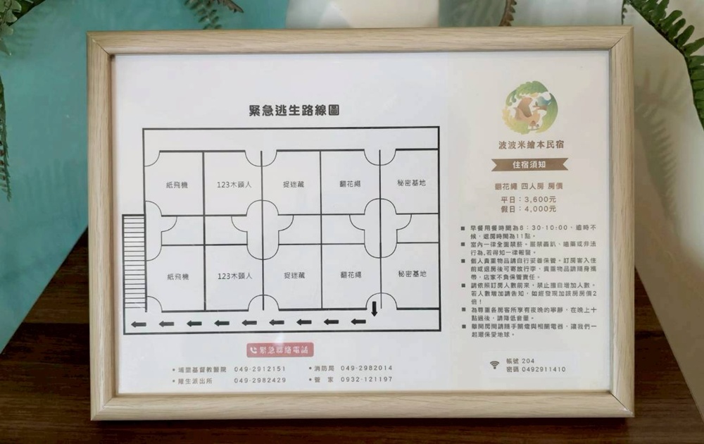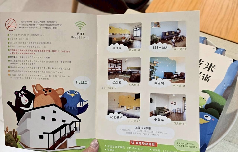 波波米繪本民宿將旅遊資訊都變得很有趣!民宿特別準備了一本像繪本一樣的小書,裡面不只有房間介紹和入住規則,還把埔里的在地美食、必逛景點,甚至日月潭的玩法都收錄進去。小朋友翻起來像看故事書,大人翻起來就像旅遊攻略,一家人都能從這本小書裡找到專屬的旅行靈感。