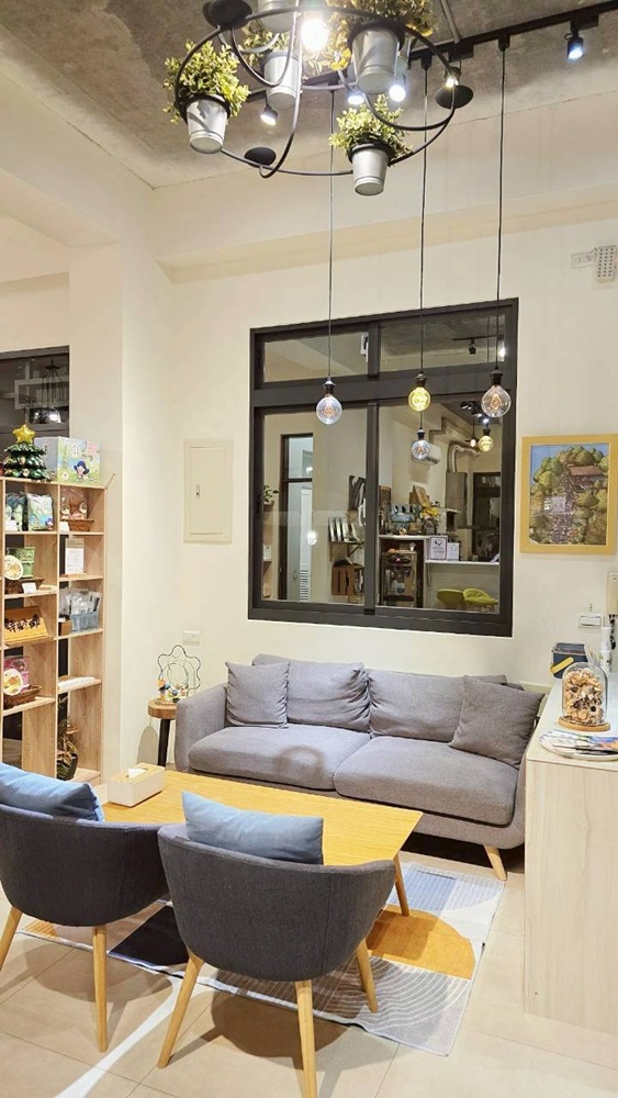 公共客廳的空間布置得很舒服,灰色沙發搭配木質茶几與單椅,氛圍溫暖又自在。頭頂的吊燈設計很有巧思,還放上小盆栽點綴,讓整個空間更有生活感,坐在這裡聊天或休息都很愜意。