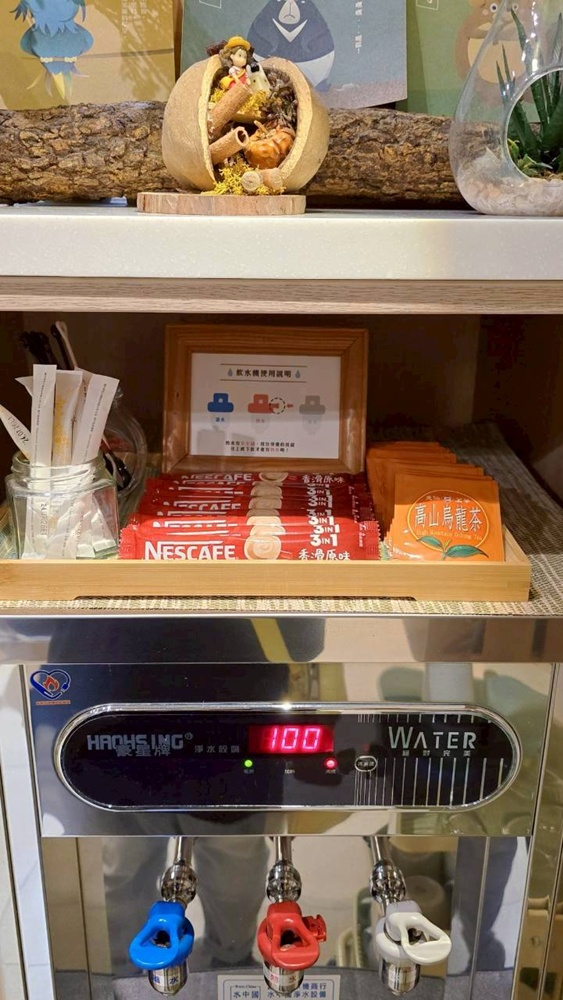 櫃檯旁的飲水機上還有提供三合一咖啡、茶包等。