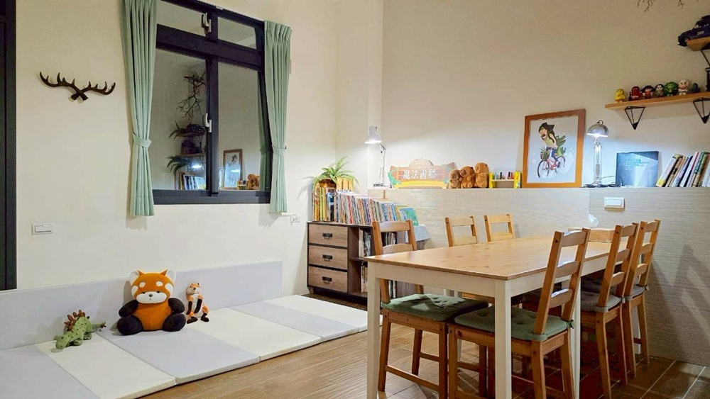 架上的繪本孩子們一看到就眼睛發亮,大人也能坐在沙發上輕鬆聊天,或陪著一起翻書。整體氛圍溫馨又放鬆,帶著小孩來住真的很安心。