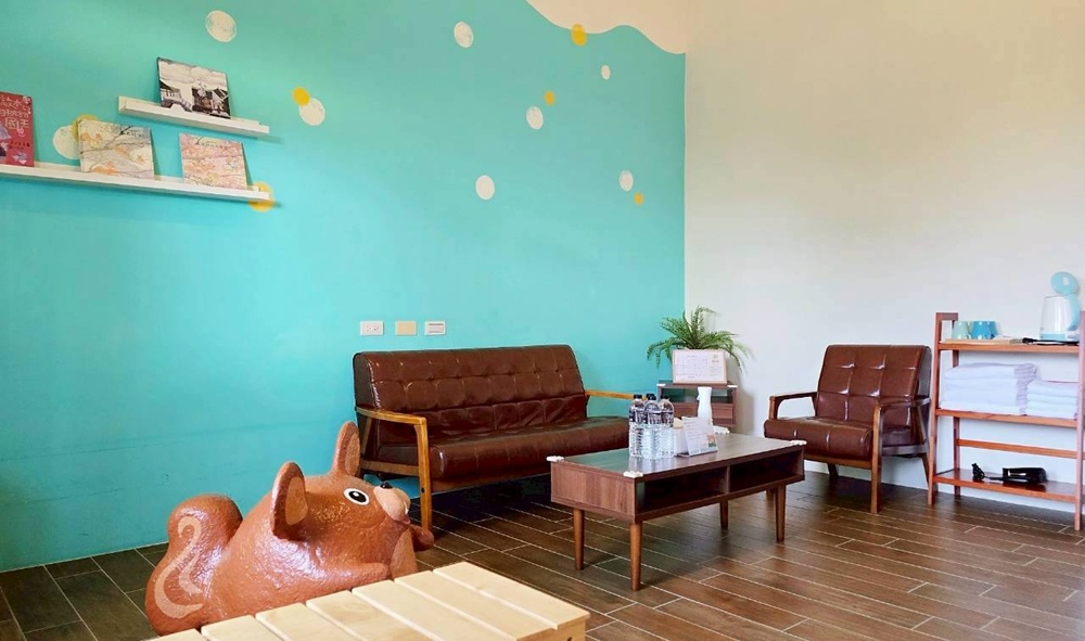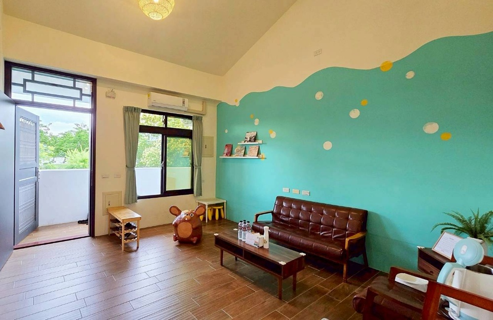 走進波波米繪本民宿的四人房,給人的第一感覺就是很明亮、很溫馨。房間裡有大片窗戶,陽光灑進來很舒服,外面的走道還能看看綠意。牆面用了清新的湖水藍色,加上手繪的小圓點裝飾,看起來就像童話場景一樣。客廳區有復古皮沙發、茶几,還放了繪本跟玩偶,很適合一家人或是朋友一起窩著聊天、翻翻書。整體氛圍簡單卻帶點童趣,讓人一進來就覺得放鬆自在。