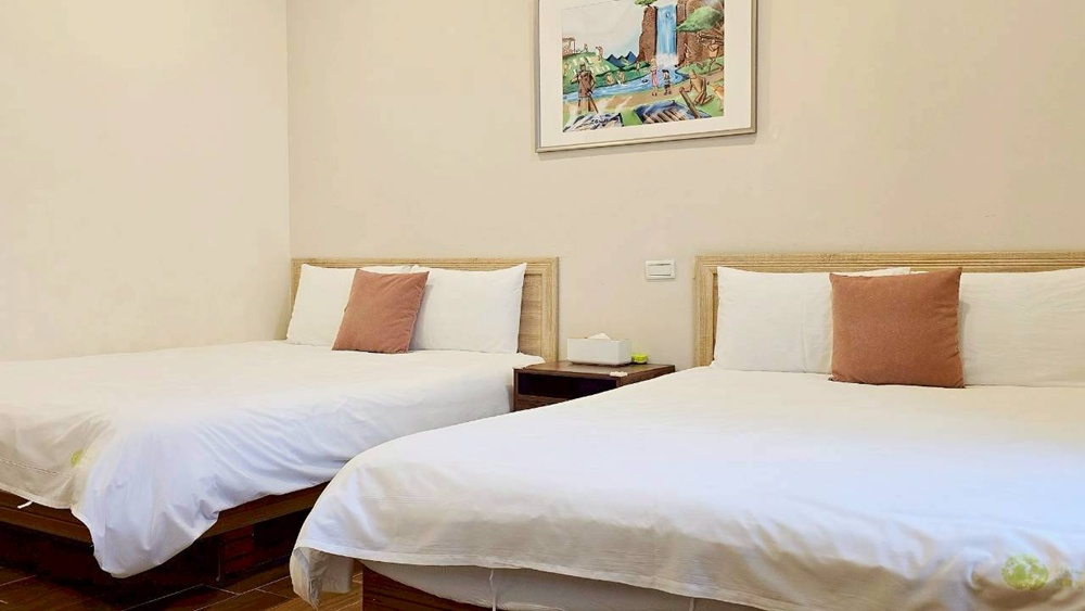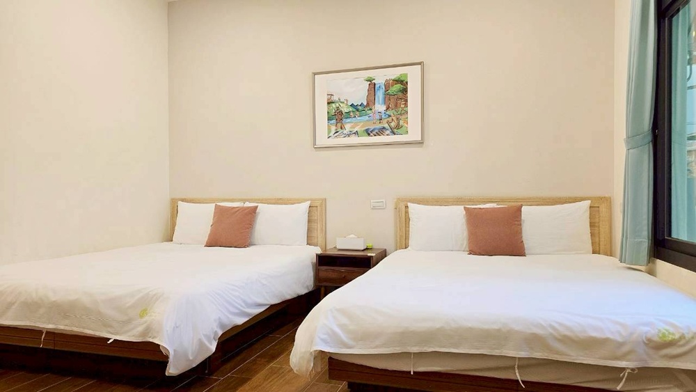 房間裡擺放了兩張舒適的雙人床,乾淨簡單的擺設看起來很舒服,牆上還掛著一幅童趣的畫作,增添了一點溫馨感。外面還有小陽台,可以走出去看看景色、吹吹風,讓整個空間更有放鬆的氛圍。