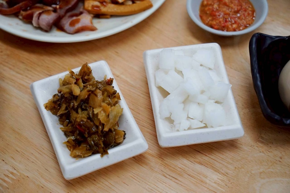 小菜部分我們選了豆干、海帶以及豬頭皮,都是看似簡單卻很耐吃的經典款。豆干滷得相當入味,口感紮實卻不乾硬,咀嚼時能感受到淡淡的滷香;海帶則是軟中帶點脆度,吃起來清爽不膩,很適合在吃麵的空檔來上一口。豬頭皮表現也很不錯,口感Q彈帶點膠質感,處理得乾淨不油膩,越嚼越香。再搭配店家自製辣椒一起享用,辣椒的香氣與微辣感立刻替小菜加分,整體風味層次更豐富,也讓人忍不住一口接一口。
