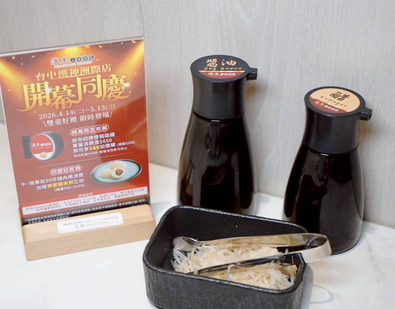 餐桌上均有提供醬油、醋以及薑絲,如果需要辣油可以跟服務人員詢問喔!