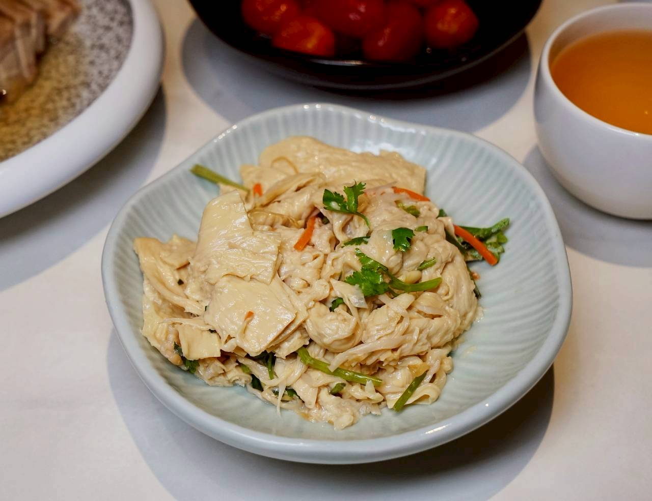 香根腐衣。腐衣本身吸附醬汁之後帶點微軟的口感還保有一點嚼感。加上香菜讓整體味道變得很清新,吃起來不會厚重,我們很喜歡這風味!