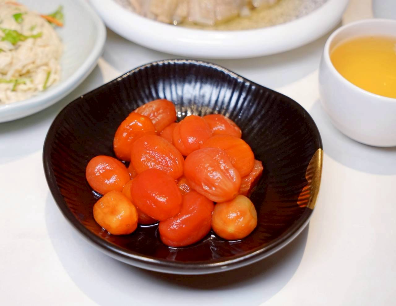 梅漬蕃茄。咬下去是那種多汁又帶點微酸的清爽感,加上梅子的酸甜醃漬香氣,整個味道會在嘴裡慢慢散開,加上冰冰涼涼的更是開胃聖品。