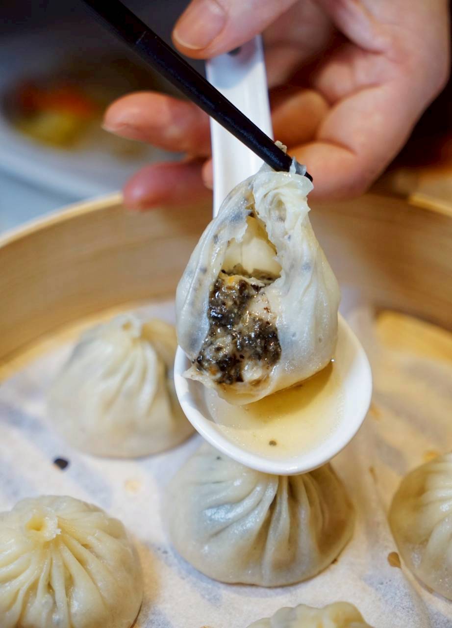 輕咬開後,黑松露的香氣會慢慢竄出來,搭配雞肉的鮮嫩口感,是比較細緻、偏香氣系的一款湯包。