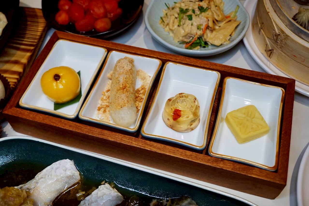 甜點四拼,由左至右分別是奶皇南瓜糰子→掛霜紅豆糖糕→蜂蜜桂花凍→綠豆糕。