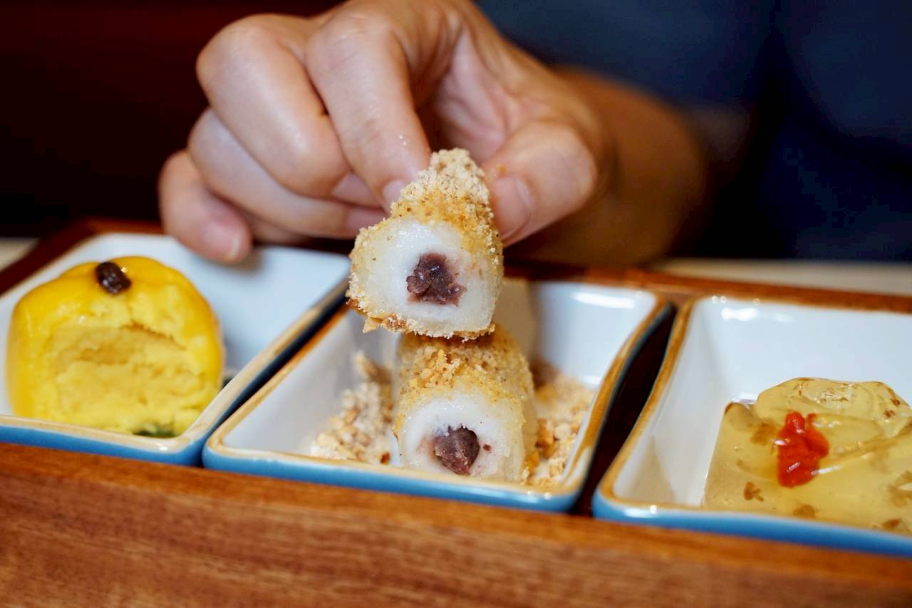 奶皇南瓜糰子是軟Q帶南瓜香,裡頭奶皇餡帶點綿細的濃郁口感;掛霜紅豆糖糕外層帶一點糖霜感,吃起來像是紅豆麻糬的風味喔!四種口感一次吃到,從濃郁到清爽都有,算是很完整的一組飯後甜點組合唷!