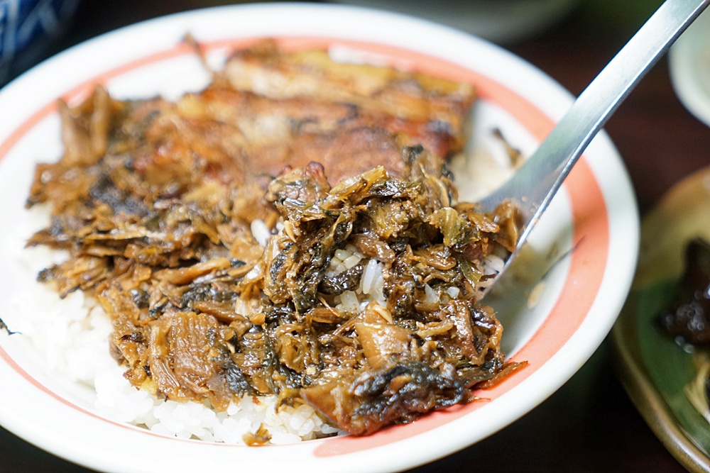 搭配的梅干菜鹹香中帶點獨特的發酵香氣,與濃郁的扣肉形成絕妙平衡。白飯吸附著滷汁與梅干的滋味,每一口都充滿層次感,越吃越涮嘴。