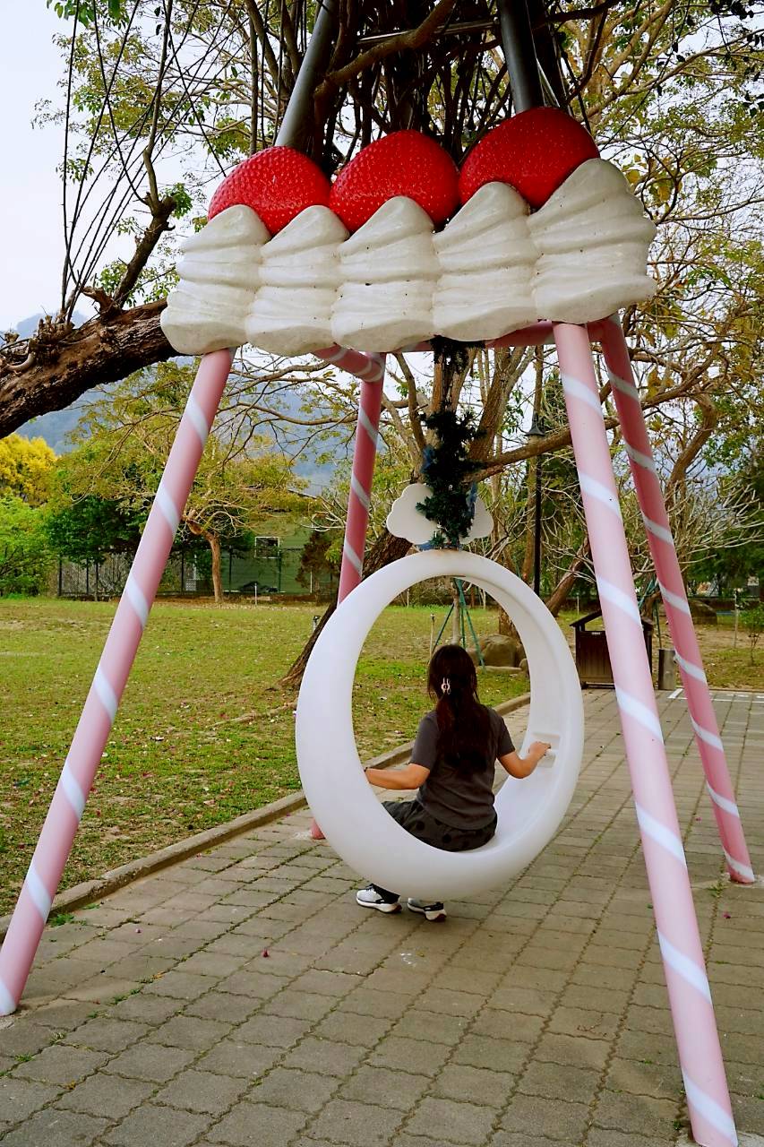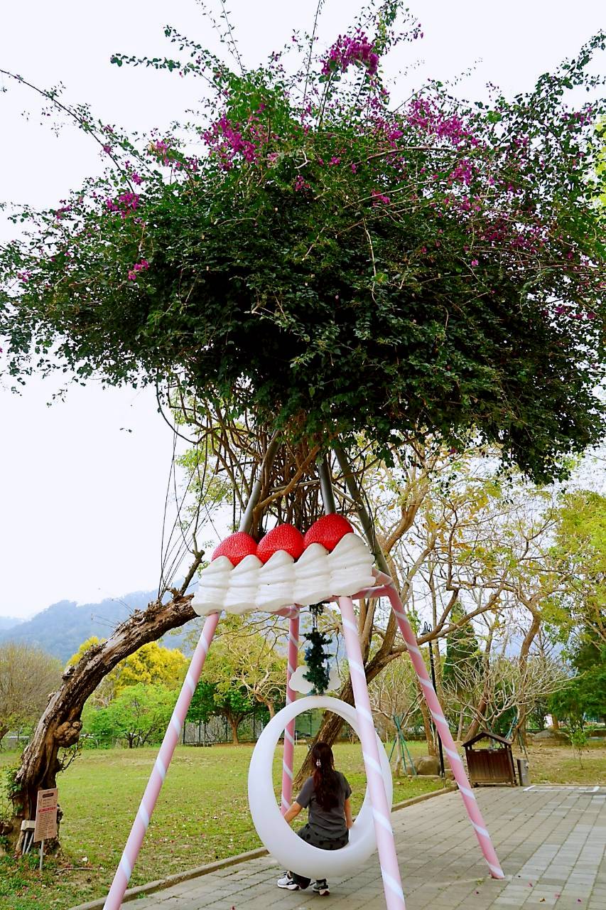 巧克力夢想館前有個超好拍的造景,超適合打卡~九重葛下還有夢幻鞦韆,坐上去搖一搖超療癒,旁邊還有小草莓點綴,整個畫面就是甜甜的童話感。