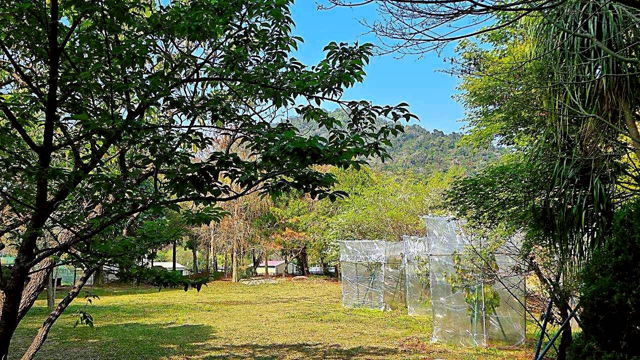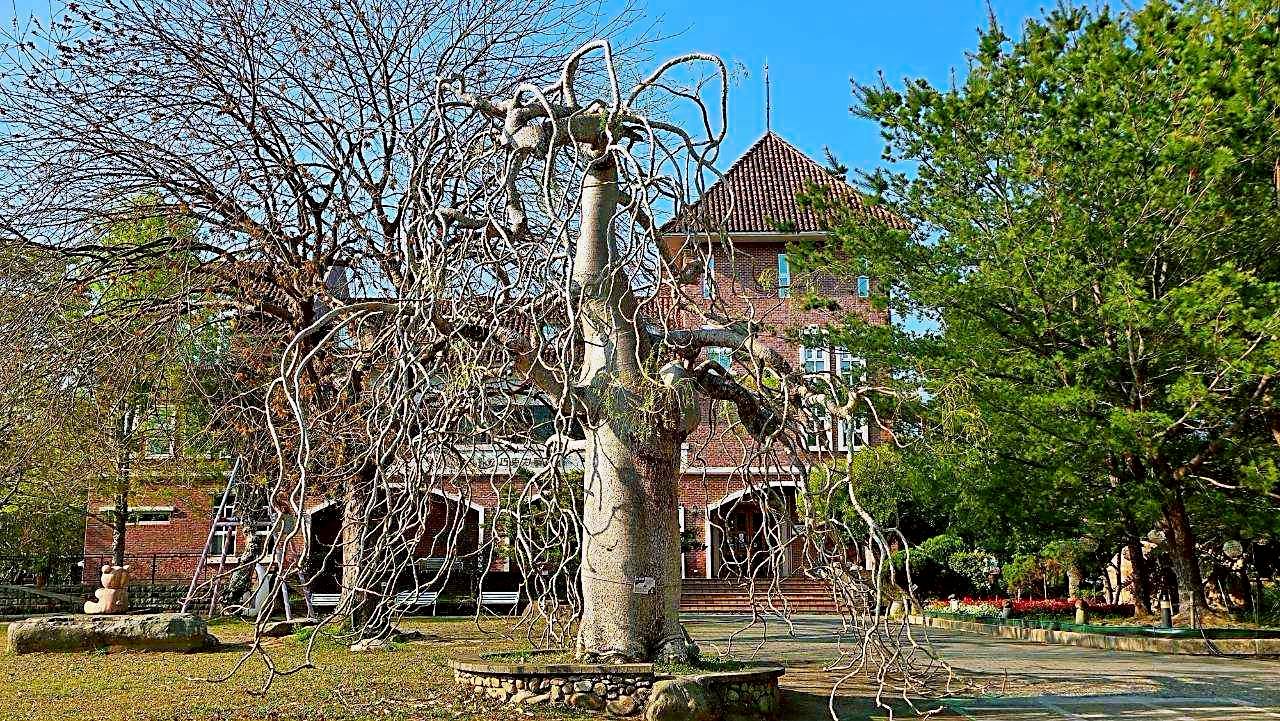 緊接著,我們沿著步道前往今晚入住的房間。剛好天氣晴朗,陽光灑落在園區裡,映照出巧克力雲莊的綠意與建築特色。沿途最吸睛的,就是這棵超巨大的象腿樹,壯觀又帶點童趣,站在樹下拍照真的超級合適,怎麼拍都好看!
