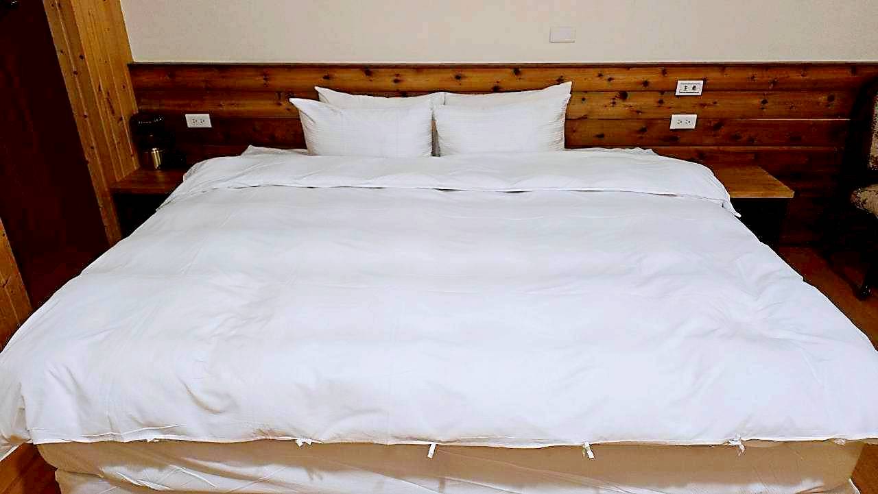 床頭邊也有不少插座和小燈。夜晚想要滑個手機、衝個電也沒問題!柔軟的床鋪、溫馨的裝潢,再加上窗外自然景色,這間套房真的很適合一家大小或朋友一起入住,享受一段放鬆又溫暖的巧克力度假時光。