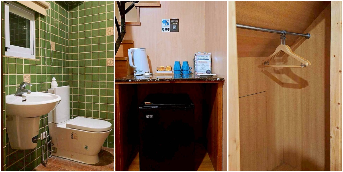 衣架吊掛區、小冰箱、充電式加熱壺、茶杯、茶包通通有。