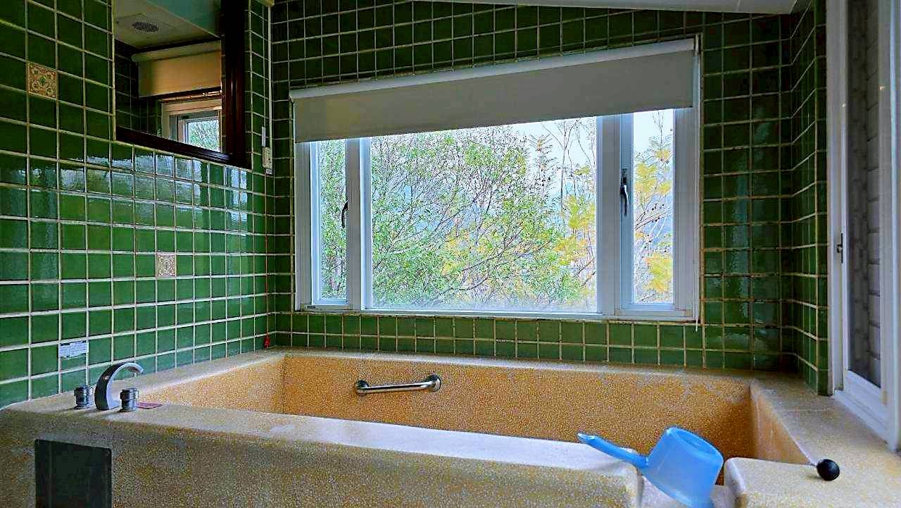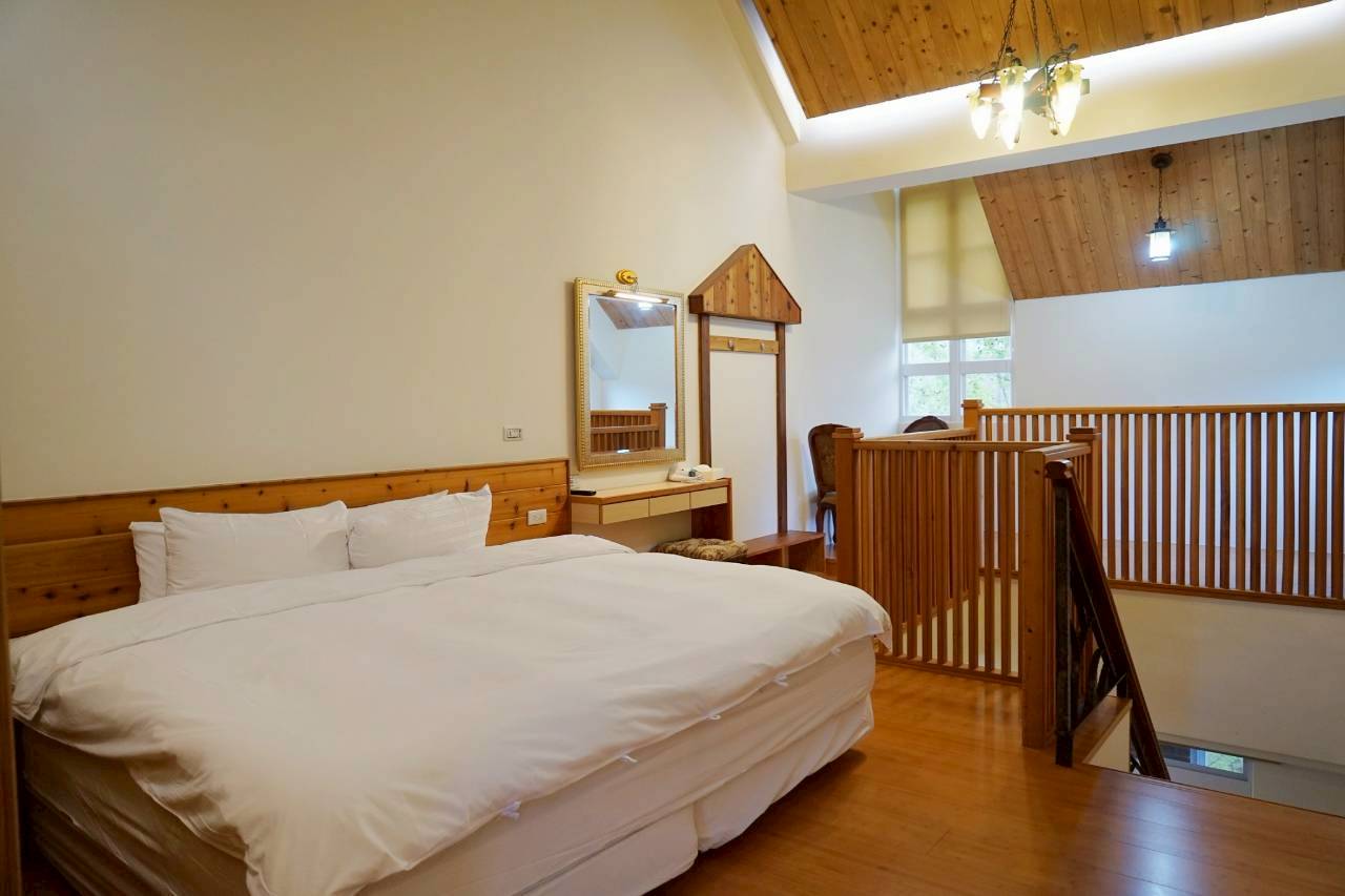 房間格局是樓中樓設計,一樓是寬敞的客廳,採光良好,窗外也正好有盛開的紫藤花,可以坐在窗邊或客廳裡賞花放鬆。一樣也有泡湯池且外面就是景色優美的田園風格,二樓則規劃了兩張舒適床鋪,最多可睡 4 人,非常適合家庭或朋友一起入住。整間房兼具景觀與舒適度,讓人在房內就能感受到大自然的療癒感,完全是一個放慢步調、好好享受度假的空間。