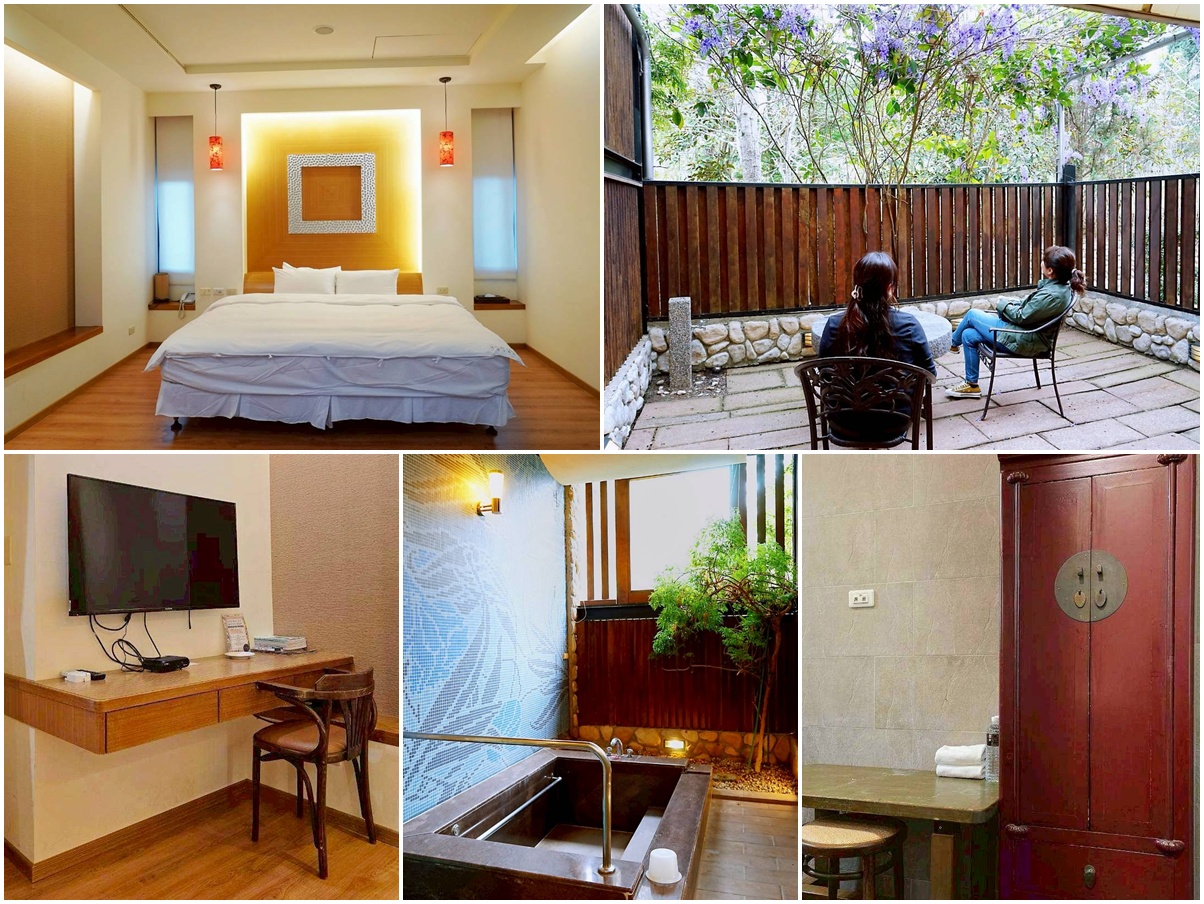 我們來到空間密碼雙人房,這間房間同樣充滿巧思與特色。一進房就能感受到溫馨舒適的氛圍,提供的是雙人的大床,床鋪柔軟舒適,睡起來非常放鬆。這間房最大的亮點是有私人庭園,現在正值紫藤花盛開季節,坐在庭園裡賞花,感受微風與花香,非常悠閒放鬆。此外,房內還有泡湯池,讓入住的時光更添療癒感。而房裡的衣櫥更特別,是店家收藏的老舊小物,每一件都帶著復古的故事感,增添房間的獨特魅力。