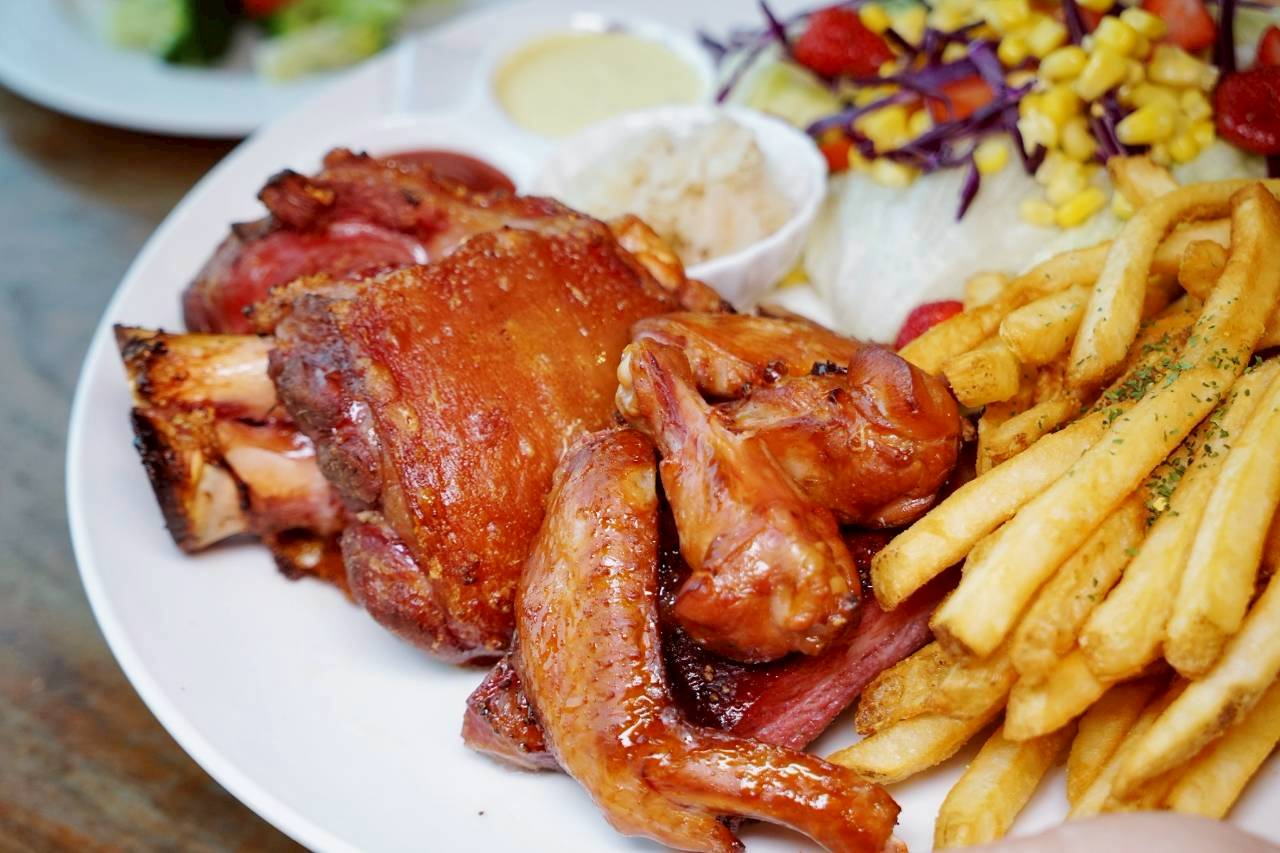 歐風雙人烤盤內容有:德國豬腳、煙燻雞翅腿、煙燻肋排、生菜沙拉、薯條、以及兩杯飲料。