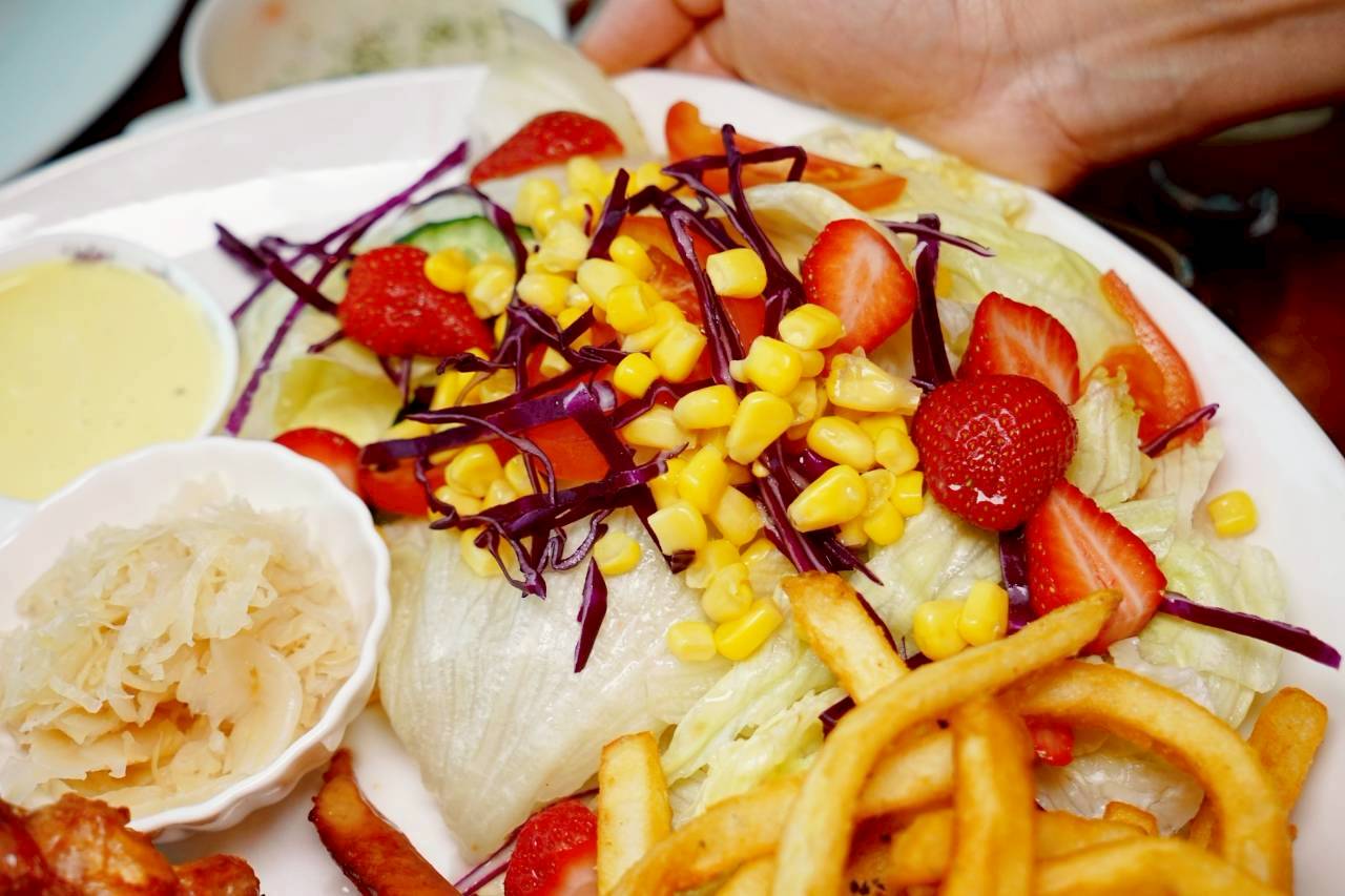 烤盤搭配的 生菜沙拉 非常清爽,不只生菜,還有玉米、小黃瓜、洋蔥,以及大量新鮮草莓,每一口都帶點甜味與脆口感,剛好中和了烤肉的油膩感