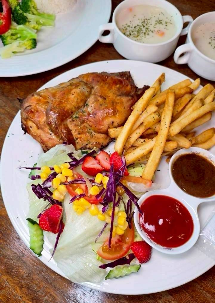 另一道必點的主廚推薦料理是 巧克力香烤春雞。烤得金黃酥脆的春雞外皮帶著香氣,肉質鮮嫩多汁,每一口都充滿濃郁的烤香。隨餐搭配脆薯與 生菜沙拉,沙拉裡有新鮮蔬菜與番茄,爽口清新,剛好平衡了雞肉的香濃。