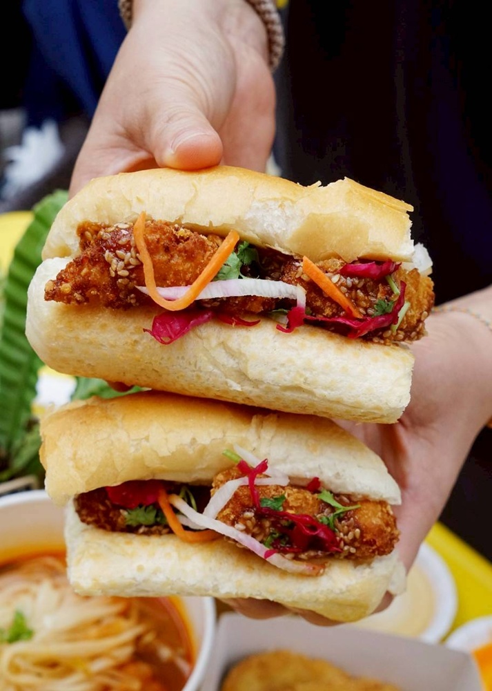 炸魚法國麵包的手工麵包外酥內韌,帶著淡淡麵香,越嚼越香、越吃越涮嘴,份量也相當大,完全吃得飽足。裡頭的炸魚塊厚實香酥,魚肉細緻多汁,一口咬下去還能感受到魚肉的鮮嫩與麵包的酥脆交錯。再搭配白蘿蔔泡菜、醃漬紫高麗菜和洋蔥絲等多層次蔬菜,每一口都能吃到不同口感:酥脆、軟嫩、清爽交織,讓整份法國麵包的層次感十足,吃起來超有滿足感。