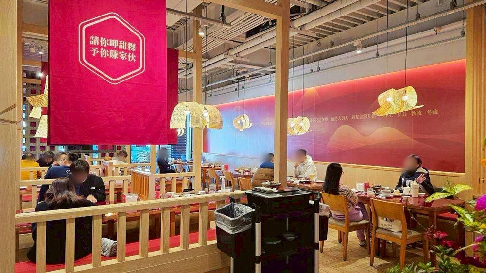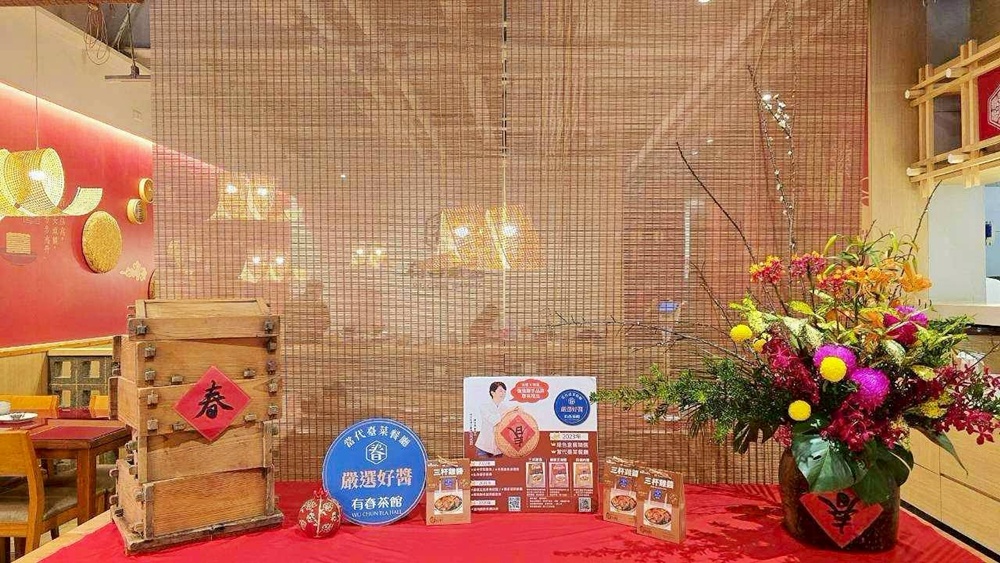再來我們就來到有春茶館的內觀:紅色布幔上印著有春的標誌,低調卻很有存在感,搭配竹編燈罩與柔和燈光,讓整個空間多了一點傳統茶館的味道,但又不會顯得老派。整體裝潢介於現代與復古之間,是那種台中人會覺得熟悉、坐起來也自在的茶館空間。