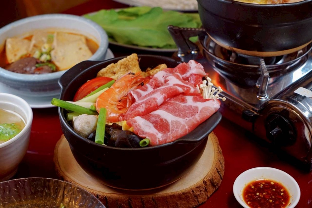 扁魚沙茶鍋是有春茶館新推出的鍋物之一,一上桌就能感受到份量十足。鍋裡有五花肉片、鮮蝦、金針菇、腐皮捲、木耳、蛋餃、虱目魚丸與青蔥,食材豐富又澎湃。多以原型食材來搭配經典扁魚沙茶,吃起來較不會有負擔。