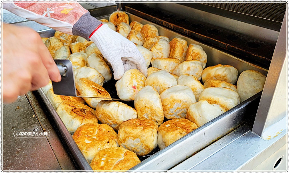 小涼繞道水煎包煎台這邊看,這裡的水煎包跟一般我在外看到用圓盤煎的不一樣,這裡除了正反面都煎的恰恰金黃以外,就連邊邊也會弄起來煎一下唷!! 所以不管你從哪個方向咬過去都酥香..